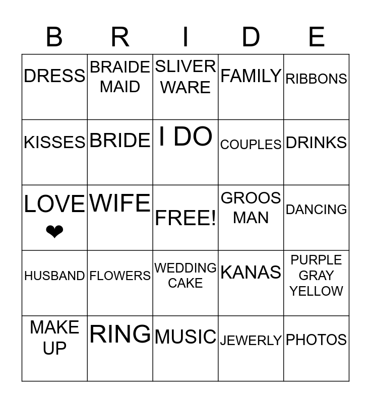 This bingo card has a free space and 24 words: FLOWERS, RING, I DO, MAKE UP, RIBBONS, DRESS, KISSES, BRAIDE MAID, GROOS MAN, WEDDING CAKE, COUPLES, LOVE ❤, KANAS, PURPLE GRAY YELLOW, BRIDE, JEWERLY, DANCING, SLIVER WARE, DRINKS, WIFE, PHOTOS, HUSBAND, FAMILY and MUSIC.