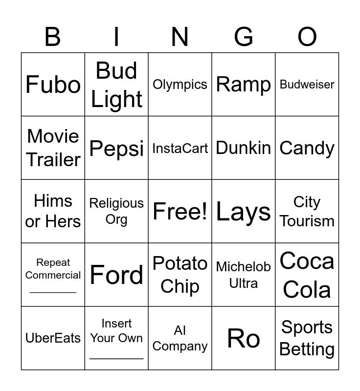 This bingo card has a free space and 24 words: Ford, Insert Your Own ________, InstaCart, UberEats, Budweiser, Fubo, Movie Trailer, Bud Light, Lays, Potato Chip, Dunkin, Hims or Hers, Michelob Ultra, Coca Cola, Pepsi, Ro, City Tourism, Olympics, Candy, Religious Org, Sports Betting, Repeat Commercial ________, Ramp and AI Company.