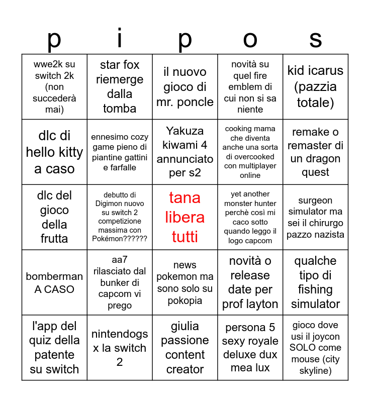 This bingo card has a free space and 24 words: aa7 rilasciato dal bunker di capcom vi prego, nintendogs x la switch 2, Yakuza kiwami 4 annunciato per s2, l'app del quiz della patente su switch, kid icarus (pazzia totale), wwe2k su switch 2k (non succederà mai), dlc di hello kitty a caso, star fox riemerge dalla tomba, yet another monster hunter perchè così mi caco sotto quando leggo il logo capcom, news pokemon ma sono solo su pokopia, cooking mama che diventa anche una sorta di overcooked con multiplayer online, dlc del gioco della frutta, novità o release date per prof layton, qualche tipo di fishing simulator, ennesimo cozy game pieno di piantine gattini e farfalle, persona 5 sexy royale deluxe dux mea lux, surgeon simulator ma sei il chirurgo pazzo nazista, il nuovo gioco di mr. poncle, remake o remaster di un dragon quest, debutto di Digimon nuovo su switch 2 competizione massima con Pokémon??????, gioco dove usi il joycon SOLO come mouse (city skyline), bomberman A CASO, novità su quel fire emblem di cui non si sa niente and giulia passione content creator.