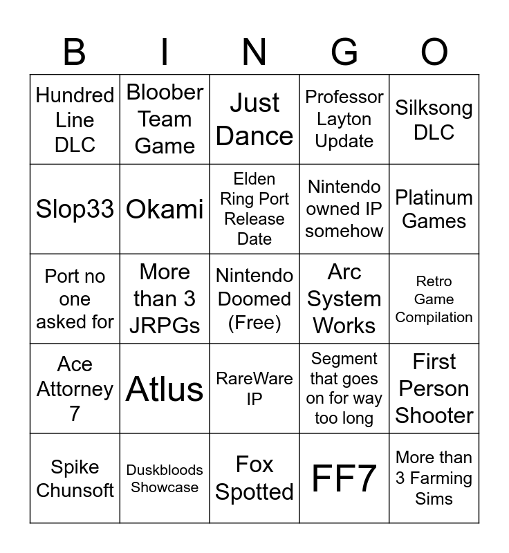 This bingo card has a free space and 24 words: Atlus, Duskbloods Showcase, Elden Ring Port Release Date, Spike Chunsoft, Silksong DLC, Hundred Line DLC, Slop33, Bloober Team Game, Arc System Works, RareWare IP, Nintendo owned IP somehow, Port no one asked for, Segment that goes on for way too long, First Person Shooter, Okami, FF7, Retro Game Compilation, Just Dance, Platinum Games, More than 3 JRPGs, More than 3 Farming Sims, Ace Attorney 7, Professor Layton Update and Fox Spotted.
