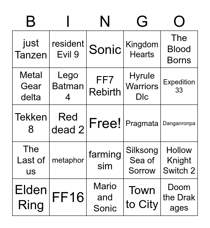 This bingo card has a free space and 24 words: metaphor, FF16, FF7 Rebirth, Elden Ring, The Blood Borns, just Tanzen, Metal Gear delta, resident Evil 9, Pragmata, farming sim, Hyrule Warriors Dlc, Tekken 8, Silksong Sea of Sorrow, Hollow Knight Switch 2, Lego Batman 4, Town to City, Danganronpa, Sonic, Expedition 33, Red dead 2, Doom the Drak ages, The Last of us, Kingdom Hearts and Mario and Sonic.