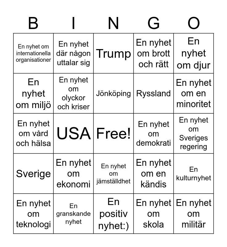 This bingo card has a free space and 24 words: En nyhet om ekonomi, En granskande nyhet, Jönköping, En nyhet om teknologi, En nyhet om djur, En nyhet om internationella organisationer, En nyhet om miljö, En nyhet där någon uttalar sig, En nyhet om demokrati, En nyhet om jämställdhet, Ryssland, En nyhet om vård och hälsa, En nyhet om en kändis, En kulturnyhet, En nyhet om olyckor och kriser, En nyhet om skola, En nyhet om Sveriges regering, Trump, En nyhet om en minoritet, USA, En nyhet om militär, Sverige, En nyhet om brott och rätt and En positiv nyhet:).