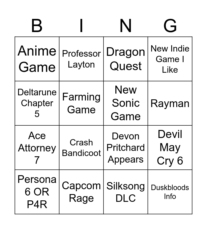 This bingo card has 16 words: Capcom Rage, Devil May Cry 6, Dragon Quest, Anime Game, Ace Attorney 7, Professor Layton, Devon Pritchard Appears, Silksong DLC, Deltarune Chapter 5, Farming Game, Persona 6 OR P4R, New Indie Game I Like, Crash Bandicoot, Rayman, New Sonic Game and Duskbloods Info.
