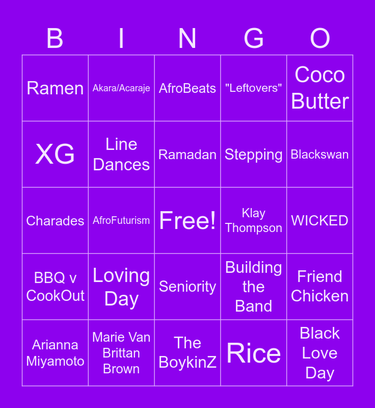 This bingo card has a free space and 33 words: PRIDE Month, Haitian Revolution, AfroFuturism, Rhythm & Flow, BBQ v CookOut, Line Dances, Coco Butter, Arianna Miyamoto, Akara/Acaraje, Juneteenth, Ramadan, AfroBeats, Just Dance, Pasta, Klay Thompson, Blackswan, Marie Van Brittan Brown, Charades, Loving Day, Building the Band, Seniority, Kim Insooni, Ramen, WICKED, The BoykinZ, Black Love Day, "Leftovers", Stepping, XG, Friend Chicken, Poker, Rice and Soccer.