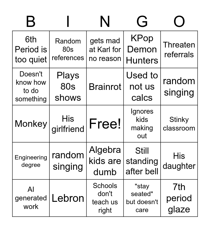 This bingo card has a free space and 31 words: Schools don't teach us right, "I probably shouldn't be telling you guys this but...", His girlfriend, No touching, 6th Period is too quiet, gets mad at Karl for no reason, Plays 80s shows, Still standing after bell, Ignores kids making out, "stay seated" but doesn't care, Stinky classroom, 7th period glaze, Tiger Woods, We can't do math, random singing, AI, His daughter, random singing, Engineering degree, Algebra kids are dumb, Threaten referrals, IB kids are dumb, AI generated work, Random 80s references, Used to not us calcs, Doesn't know how to do something, KPop Demon Hunters, Monkey, Lebron, Brainrot and Ms Smiley hate.