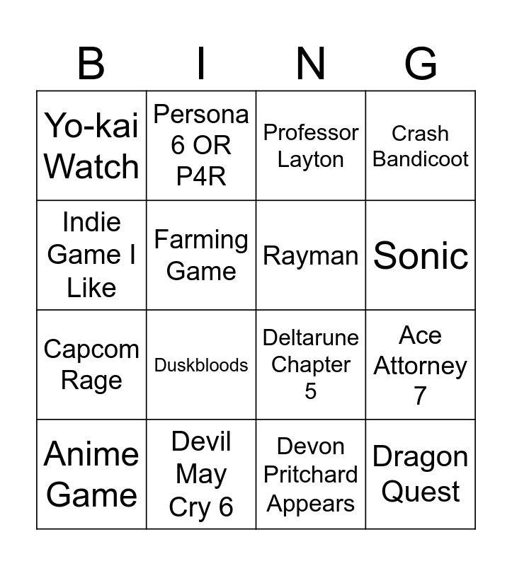 This bingo card has 16 words: Devil May Cry 6, Ace Attorney 7, Professor Layton, Yo-kai Watch, Capcom Rage, Persona 6 OR P4R, Deltarune Chapter 5, Devon Pritchard Appears, Indie Game I Like, Farming Game, Anime Game, Crash Bandicoot, Duskbloods, Sonic, Rayman and Dragon Quest.