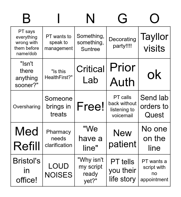This bingo card has a free space and 52 words: Allye's Late, PT wants a script with no appointment, Someone orders food delivery, "Why isn't my script ready yet?", Pharmacy needs clarification, Needs fax number, PT wants to speak to management, UTI symptoms, "Isn't there anything sooner?", No MA response, "Is this HealthFirst?", Callback, No one on the line, New patient, PT refuses to go to ER or Urgent Care, PT starts yelling, Critical Lab, PT calls back without listening to voicemail, Wants to be seen today, Tayllor visits, Someone brings in treats, PT tells you their life story, PT says everything wrong with them before name/dob, Prior Auth, PT calls more than once, PT is leaving the provider/HF, Call from Home Care, Rae doing IT, ok, PT calls multiple times with no results, Habla espanol, Decorating party!!!!, Rae throws her headset, Someone crashes out, "HELLO?!?", Something, something, Suntree, LOUD NOISES, Insurance company calling, Person on the other line is chewing something, Patient starts swearing, Patient makes you hang up first, Send lab orders to Quest, Med Refill, Drama in the group chat, "We have a line", "Do I have to fast for my labs?", Appointment confirmation, Oversharing, PT gets mad we don't accept TOC, "Do you accept this insurance?", Bristol's in office! and Steph asks if she can go home.