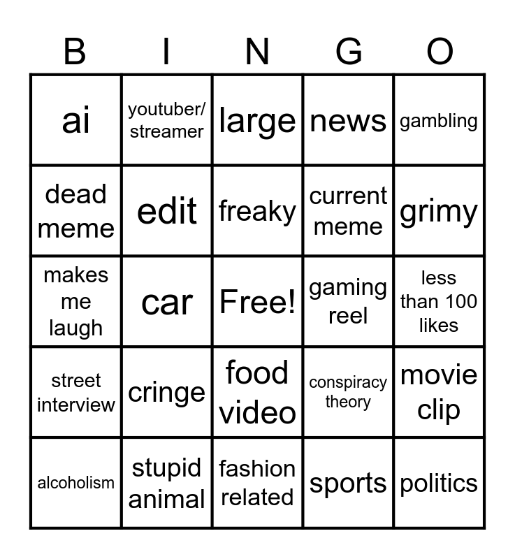 This bingo card has a free space and 24 words: cringe, stupid animal, freaky, alcoholism, gambling, ai, dead meme, youtuber/ streamer, gaming reel, food video, current meme, makes me laugh, conspiracy theory, movie clip, edit, sports, less than 100 likes, large, grimy, car, politics, street interview, news and fashion related.
