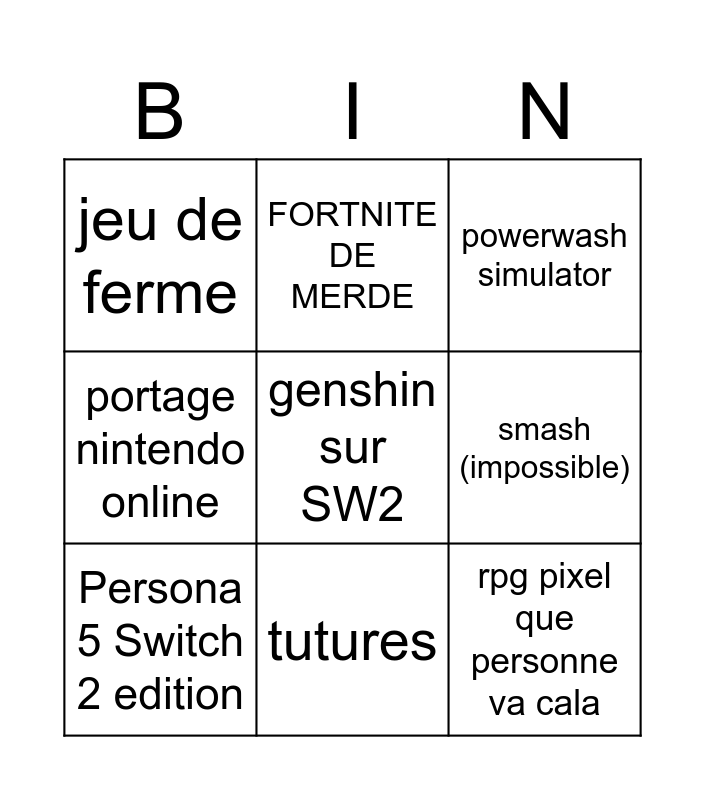This bingo card has a free space and 8 words: smash (impossible), powerwash simulator, FORTNITE DE MERDE, Persona 5 Switch 2 edition, jeu de ferme, rpg pixel que personne va cala, portage nintendo online and tutures.