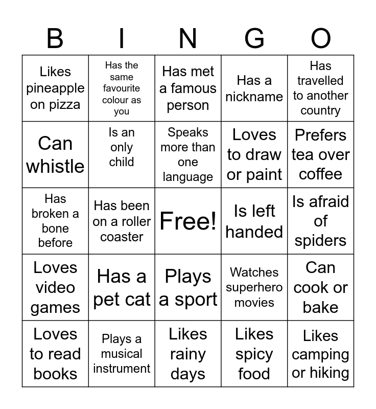 This bingo card has a free space and 24 words: Has a pet cat, Plays a musical instrument, Speaks more than one language, Loves to read books, Has travelled to another country, Likes pineapple on pizza, Can whistle, Has the same favourite colour as you, Is left handed, Plays a sport, Loves to draw or paint, Has broken a bone before, Watches superhero movies, Can cook or bake, Is an only child, Likes spicy food, Is afraid of spiders, Has met a famous person, Prefers tea over coffee, Has been on a roller coaster, Likes camping or hiking, Loves video games, Has a nickname and Likes rainy days.