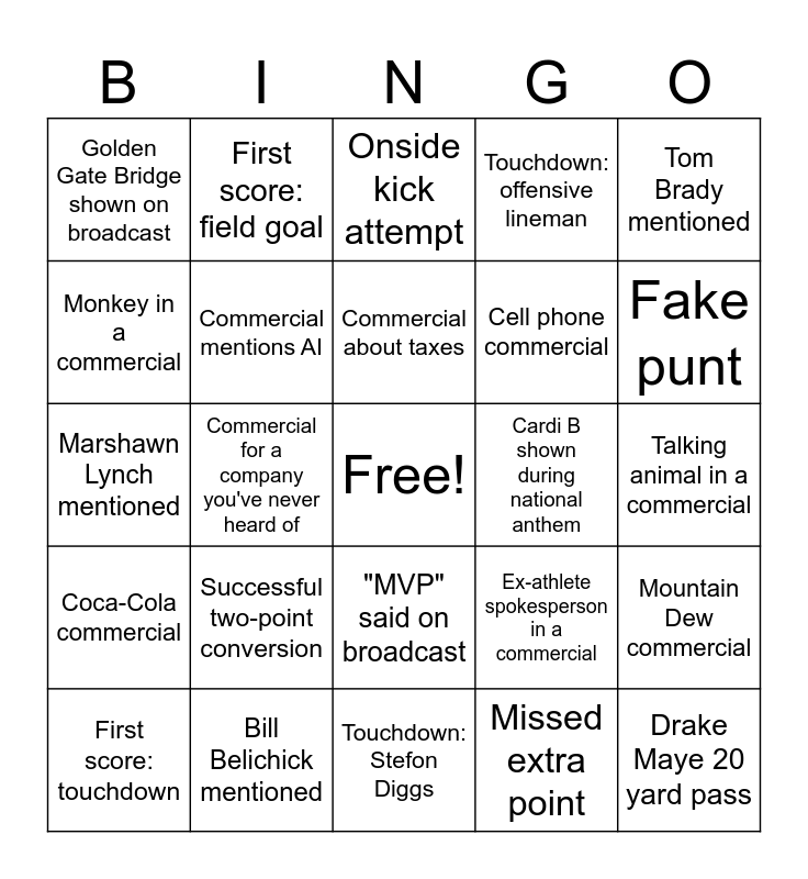 This bingo card has a free space and 44 words: Touchdown: Cooper Kupp, Drake Maye 20 yard pass, Russell Wilson mentioned, First score: touchdown, Dave Portnoy shown on camera, Missed extra point, Onside kick attempt, Touchdown in last two minutes of 4th quarter, Tom Brady mentioned, Bill Belichick mentioned, Touchdown: offensive lineman, Cardi B shown during national anthem, "MVP" said on broadcast, Successful two-point conversion, Bad Bunny song plays before commercial, Touchdown: Stefon Diggs, Successful coaches challenge, Marshawn Lynch mentioned, Jaxon Smith Njigba makes 20 yard catch, Fake punt, First score: field goal, Wide receiver rushing attempt, Team attempts 4th down conversion, Golden Gate Bridge shown on broadcast, "Coach of the Year" said on broadcast, Talking animal in a commercial, Talking food in a commercial, Movie trailer, Ex-athlete spokesperson in a commercial, Coca-Cola commercial, Song from at least 20 years ago in a commercial, Mountain Dew commercial, Clydesdales, Toilet paper commercial, Commercial for a company you've never heard of, Pro-driver disclaimer on commercial, High speed chase, Side effects include... on commercial, Commercial about taxes, Monkey in a commercial, Cell phone commercial, Tearjerker commercial, Commercial mentions AI and Winter Olympics Commercial.
