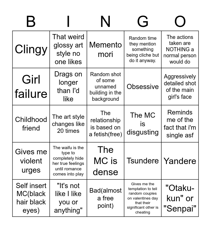 This bingo card has a free space and 24 words: The waifu is the type to completely hide her true feelings until romance comes into play, "It's not like I like you or anything", Random shot of some unnamed building in the background, Self insert MC(black hair black eyes), The actions taken are NOTHING a normal person would do, Clingy, Girl failure, That weird glossy art style no one likes, The MC is disgusting, The MC is dense, Obsessive, Childhood friend, Tsundere, Yandere, Drags on longer than I'd like, Gives me the temptation to tell random couples on valentines day that their significant other is cheating, Reminds me of the fact that i'm single asf, Memento mori, Aggressively detailed shot of the main girl's face, The art style changes like 20 times, "Otaku-kun" or "Senpai", Gives me violent urges, Random time they mention something being cliche but do it anyway. and Bad(almost a free point).