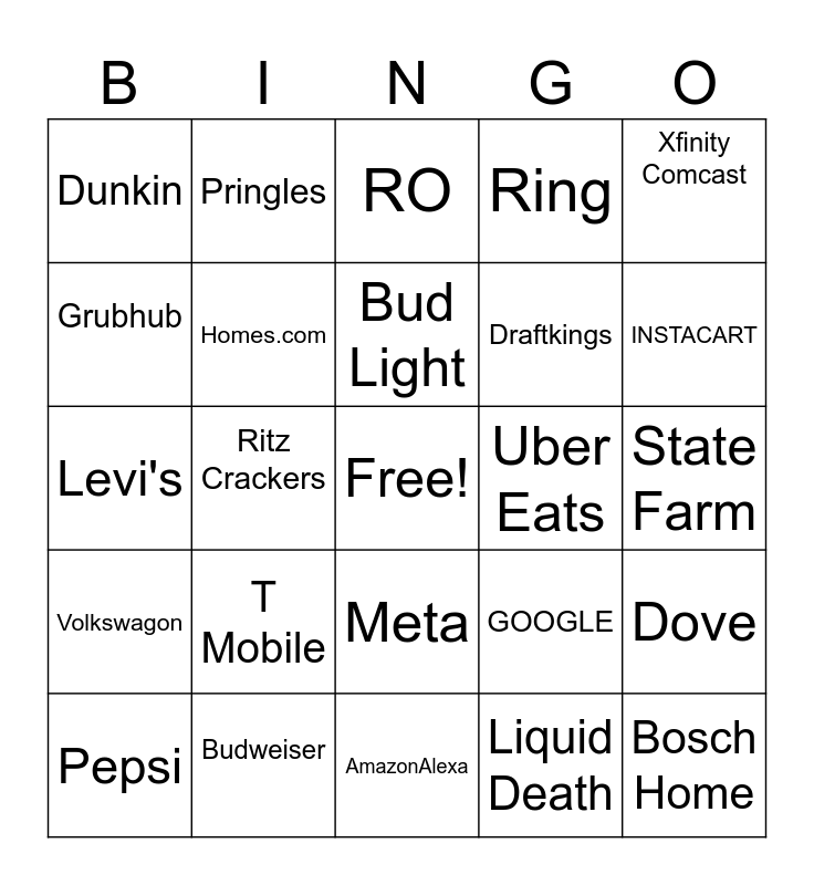 This bingo card has a free space and 24 words: T Mobile, Budweiser, Bud Light, Pepsi, Xfinity Comcast, Dunkin, Grubhub, Pringles, Uber Eats, Meta, Draftkings, Levi's, GOOGLE, Dove, Homes.com, Liquid Death, State Farm, RO, INSTACART, Ritz Crackers, Bosch Home, Volkswagon, Ring and AmazonAlexa.