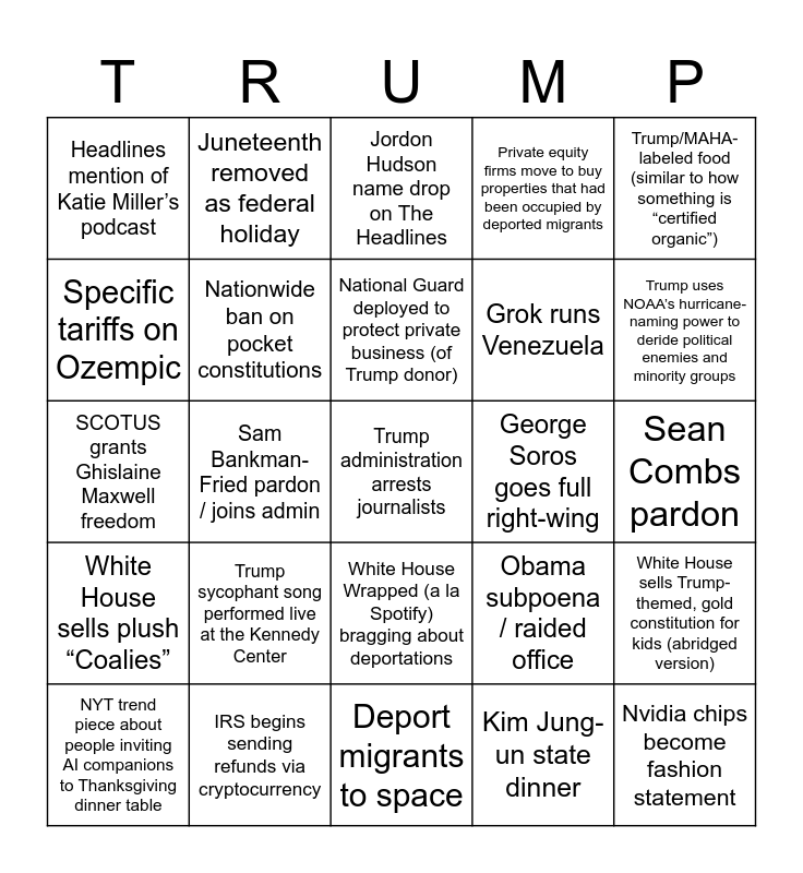 This bingo card has a free space and 24 words: Trump sycophant song performed live at the Kennedy Center, IRS begins sending refunds via cryptocurrency, National Guard deployed to protect private business (of Trump donor), NYT trend piece about people inviting AI companions to Thanksgiving dinner table, Trump/MAHA-labeled food (similar to how something is “certified organic”), Headlines mention of Katie Miller’s podcast, Specific tariffs on Ozempic, Juneteenth removed as federal holiday, George Soros goes full right-wing, White House Wrapped (a la Spotify) bragging about deportations, Grok runs Venezuela, SCOTUS grants Ghislaine Maxwell freedom, Obama subpoena / raided office, White House sells Trump-themed, gold constitution for kids (abridged version), Nationwide ban on pocket constitutions, Kim Jung-un state dinner, Sean Combs pardon, Jordon Hudson name drop on The Headlines, Trump uses NOAA’s hurricane-naming power to deride political enemies and minority groups, Sam Bankman-Fried pardon / joins admin, Nvidia chips become fashion statement, White House sells plush “Coalies”, Private equity firms move to buy properties that had been occupied by deported migrants and Deport migrants to space.