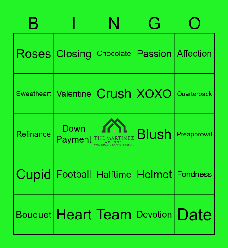 This bingo card has a free space and 62 words: Love, Heart, Kiss, Cupid, Romance, Sweet, Valentine, Hug, XOXO, Cherish, Passion, Adore, Sweetheart, Together, Forever, Roses, Date, Affection, Be Mine, Crush, Blush, Chocolate, Bouquet, Devotion, Admire, Cute, Soulmate, Embrace, Fondness, Warmth, Mortgage, Lender, Loan, Approval, Preapproval, Closing, Escrow, Interest Rate, Down Payment, Homebuyer, Refinance, Underwriting, Football, Touchdown, Quarterback, Helmet, Field, Cheer, Fans, Kickoff, Halftime, Team, Stadium, Victory, Patriots, Seahawks, Game Day, Pass, Tackle, Defense, Offense and End Zone.