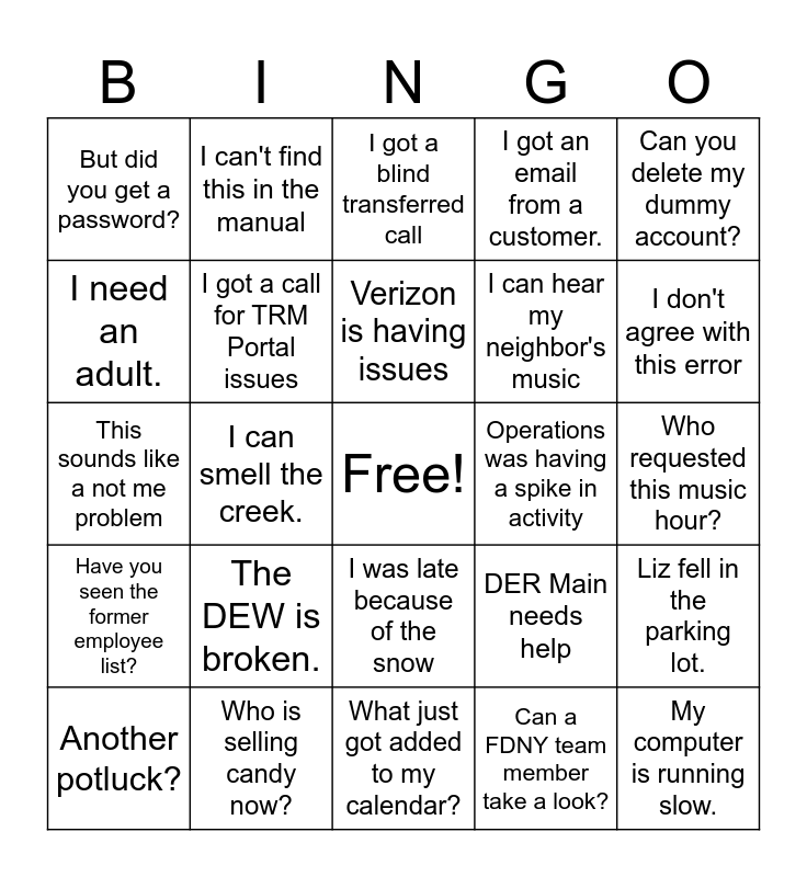 This bingo card has a free space and 34 words: BJD "Can I borrow you for a sec?", Can a FDNY team member take a look?, Is it just me or is it really cold in here?, There was an email about that?, Have you seen the former employee list?, I got a call for TRM Portal issues, Can you delete my dummy account?, Another potluck?, I can't find this in the manual, Another dealer visit?, Verizon is having issues, I got a blind transferred call, Aaron Wendt would like to talk to a SUP, The cleaners turned off my computer., Operations was having a spike in activity, I don't agree with this error, Who is selling candy now?, This sounds like a not me problem, The DEW is broken., DER Main needs help, I was late because of the snow, I could really go for a nap, But did you get a password?, Who requested this music hour?, What just got added to my calendar?, My computer is running slow., I got an email from a customer., Zoho confused me, I can hear my neighbor's music, I need an adult., Does this go to technical, IT, or programming?, I can smell the creek., Liz fell in the parking lot. and I am locked out of TRM..