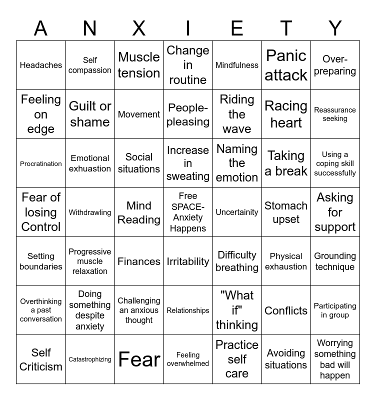 This bingo card has a free space and 48 words: "What if" thinking, Racing heart, Feeling overwhelmed, Withdrawling, Social situations, Asking for support, Self compassion, Catastrophizing, Panic attack, Irritability, Over-preparing, Change in routine, Taking a break, Naming the emotion, Overthinking a past conversation, Stomach upset, Feeling on edge, Reassurance seeking, Conflicts, Mindfulness, Riding the wave, Mind Reading, Headaches, Guilt or shame, Participating in group, Movement, Using a coping skill successfully, Self Criticism, Increase in sweating, Emotional exhuastion, Avoiding situations, Uncertainity, Grounding technique, Doing something despite anxiety, Fear of losing Control, Difficulty breathing, Physical exhaustion, Procratination, Finances, Challenging an anxious thought, Setting boundaries, Worrying something bad will happen, Muscle tension, Fear, People-pleasing, Relationships, Progressive muscle relaxation and Practice self care.