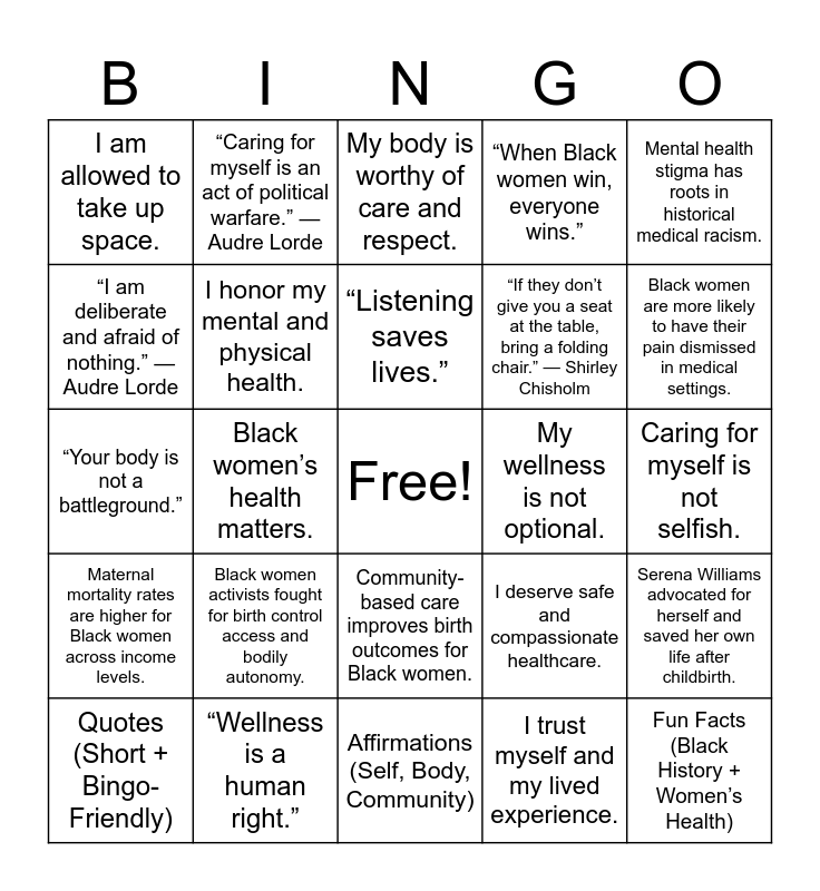 This bingo card has a free space and 31 words: Affirmations (Self, Body, Community), My voice deserves to be heard., Black women’s health matters., Rest is a form of resistance., I am allowed to take up space., My body is worthy of care and respect., I honor my mental and physical health., I deserve safe and compassionate healthcare., My wellness is not optional., I trust myself and my lived experience., Caring for myself is not selfish., Fun Facts (Black History + Women’s Health), Black women have led major reproductive justice movements., The term “reproductive justice” was coined by Black women in 1994., Black women are more likely to have their pain dismissed in medical settings., Midwives have historically been central to Black maternal care., Serena Williams advocated for herself and saved her own life after childbirth., Black women activists fought for birth control access and bodily autonomy., Maternal mortality rates are higher for Black women across income levels., Community-based care improves birth outcomes for Black women., Mental health stigma has roots in historical medical racism., Black women have always been leaders in public health advocacy., Quotes (Short + Bingo-Friendly), “Caring for myself is an act of political warfare.” — Audre Lorde, “If they don’t give you a seat at the table, bring a folding chair.” — Shirley Chisholm, “I am deliberate and afraid of nothing.” — Audre Lorde, “When Black women win, everyone wins.”, “Your body is not a battleground.”, “Wellness is a human right.”, “Listening saves lives.” and “Advocacy is self-care.”.