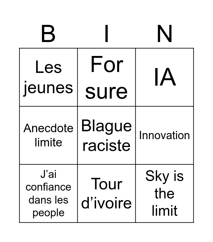 This bingo card has a free space and 8 words: Innovation, IA, For sure, J’ai confiance dans les people, Les jeunes, Sky is the limit, Anecdote limite and Tour d’ivoire.