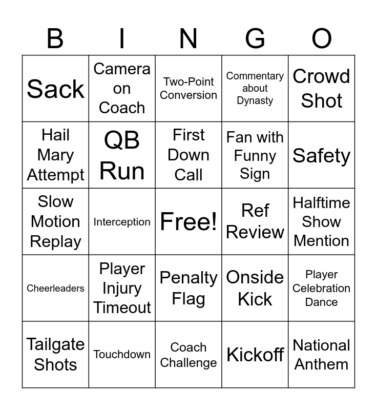 This bingo card has a free space and 30 words: Touchdown, Field Goal, Interception, Fumble, Sack, Two-Point Conversion, QB Run, Penalty Flag, Ref Review, Coach Challenge, Halftime Show Mention, National Anthem, Kickoff, Punt, Safety, Extra Point Miss, Onside Kick, Cheerleaders, Player Injury Timeout, Crowd Shot, Slow Motion Replay, Mascot on Screen, Camera on Coach, Fan with Funny Sign, Hail Mary Attempt, Commentary about Dynasty, Player Celebration Dance, Tailgate Shots, First Down Call and Super Bowl Record Mention.