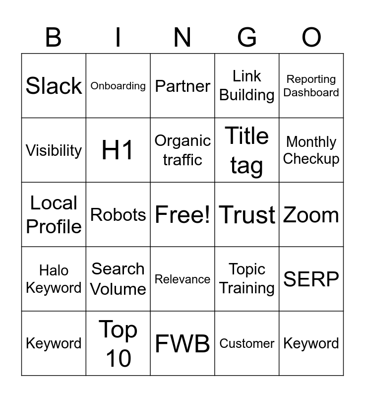 This bingo card has a free space and 44 words: SEO, Keyword, Halo Keyword, Keyword, Onsite Copy, Customer, Partner, Allocate Work, Reporting Dashboard, Top 10, Link Building, Trust, Relevance, Search Volume, KWR, FWB, OSR, Local Profile, GPB, Monthly Checkup, Onboarding, Kickoff Call, Calendly, Slack, Front, Zoom, Training Website, Success Workshop, Topic Training, Halo Keyword, Main Keyword, SERP, Ranking, Indexing, Robots, Sitemap, GSC, GA, Organic traffic, Visibility, Title tag, Meta description, H1 and New Page.