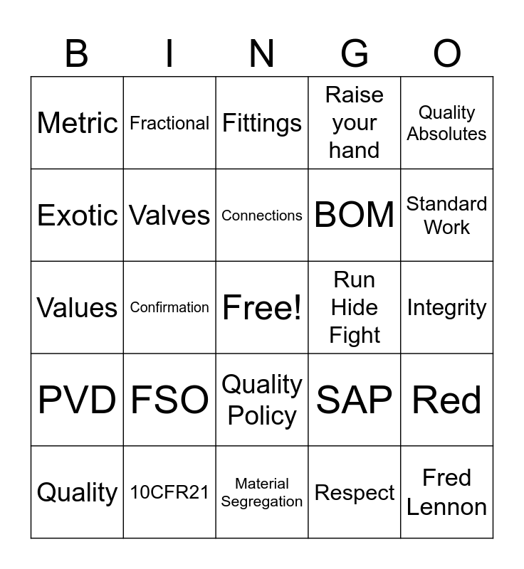 This bingo card has a free space and 24 words: Quality, FSO, Connections, Respect, Quality Absolutes, Metric, Fractional, Fittings, Run Hide Fight, Integrity, Values, Valves, SAP, Red, Exotic, 10CFR21, Material Segregation, Raise your hand, Standard Work, PVD, Confirmation, Quality Policy, BOM and Fred Lennon.
