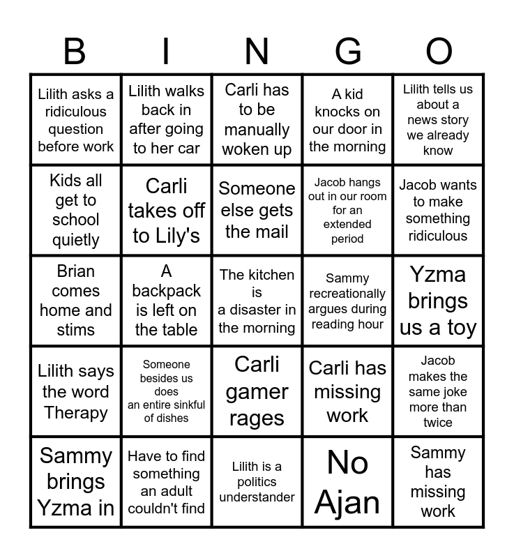 This bingo card has a free space and 29 words: Sammy brings Yzma in, Sammy forgets to click the button, A backpack is left on the table, Lilith has food in her beard, Lilith asks a ridiculous question before work, Carli has to be manually woken up, Carli takes off to Lily's, Someone besides us does an entire sinkful of dishes, Sammy recreationally argues during reading hour, Have to find something an adult couldn't find, Yzma brings us a toy, Sammy has missing work, Lilith is a politics understander, No Ajan, Jacob wants to make something ridiculous, Brian has missing work, Carli gamer rages, Lilith says the word Therapy, Lilith tells us about a news story we already know, Brian comes home and stims, Carli has missing work, Jacob asks for a show or movie, Jacob hangs out in our room for an extended period, Kids all get to school quietly, A kid knocks on our door in the morning, Lilith walks back in after going to her car, Jacob makes the same joke more than twice, Someone else gets the mail and Lilith does the cat litter after someone else did it.