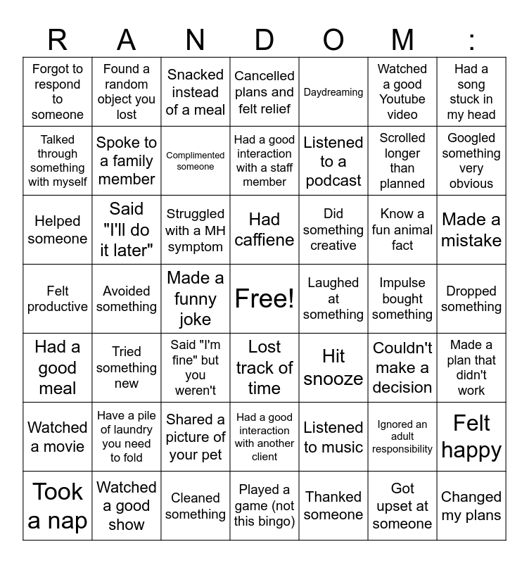 This bingo card has a free space and 48 words: Listened to music, Scrolled longer than planned, Played a game (not this bingo), Avoided something, Struggled with a MH symptom, Dropped something, Found a random object you lost, Watched a good show, Watched a good Youtube video, Lost track of time, Had a song stuck in my head, Cancelled plans and felt relief, Know a fun animal fact, Did something creative, Watched a movie, Impulse bought something, Talked through something with myself, Googled something very obvious, Ignored an adult responsibility, Daydreaming, Listened to a podcast, Made a funny joke, Forgot to respond to someone, Spoke to a family member, Felt happy, Complimented someone, Made a mistake, Took a nap, Had caffiene, Said "I'll do it later", Got upset at someone, Laughed at something, Made a plan that didn't work, Have a pile of laundry you need to fold, Felt productive, Hit snooze, Couldn't make a decision, Helped someone, Said "I'm fine" but you weren't, Shared a picture of your pet, Had a good meal, Changed my plans, Snacked instead of a meal, Cleaned something, Had a good interaction with a staff member, Had a good interaction with another client, Tried something new and Thanked someone.