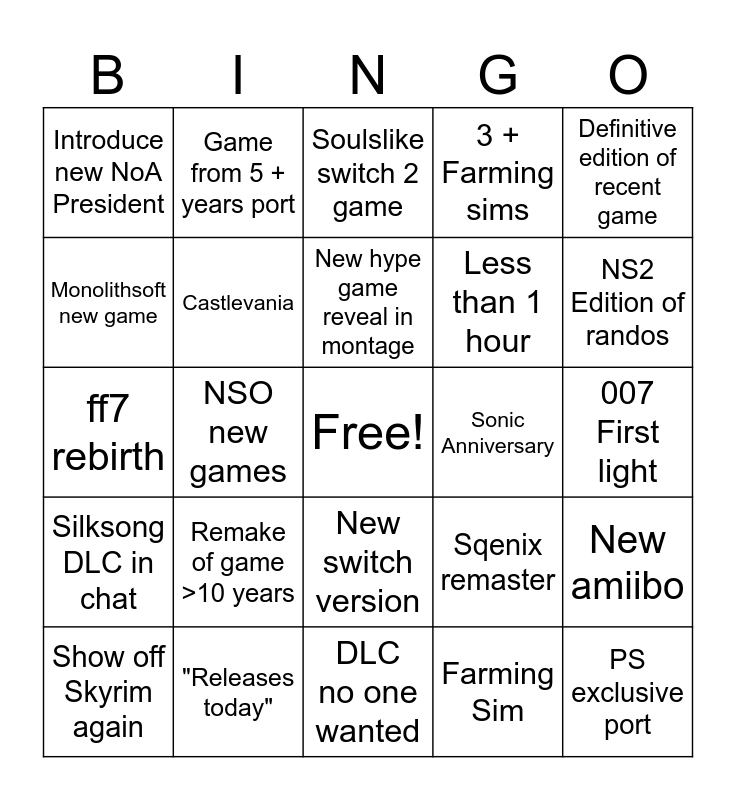 This bingo card has a free space and 24 words: Remake of game >10 years, "Releases today", New hype game reveal in montage, Show off Skyrim again, Definitive edition of recent game, Introduce new NoA President, Monolithsoft new game, Game from 5 + years port, Sonic Anniversary, New switch version, Less than 1 hour, ff7 rebirth, Sqenix remaster, New amiibo, Castlevania, Farming Sim, 007 First light, Soulslike switch 2 game, NS2 Edition of randos, NSO new games, PS exclusive port, Silksong DLC in chat, 3 + Farming sims and DLC no one wanted.