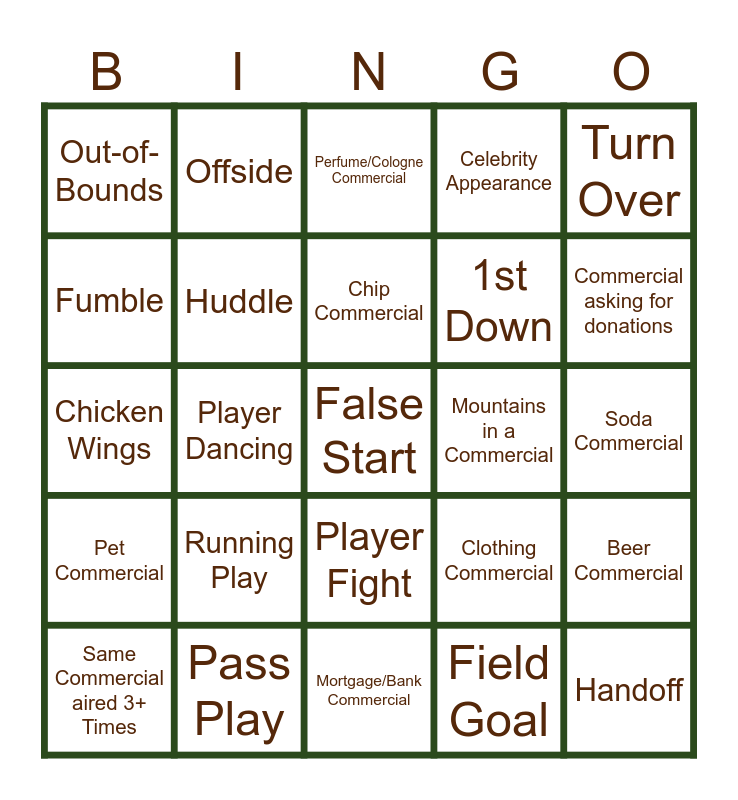 This bingo card has 55 words: Field Kick, Same Commercial aired 3+ Times, Red Flag, Out-of-Bounds, Mortgage/Bank Commercial, Animal Commercial, Huddle, 4th Down, 1st Down, Punt, Celebrity Appearance, Clydesdale Horse, Loose Ball, Betting Commercial, 'Holding', Touchdown, Turn Over, Player Dancing, Talking about Halftime Show, False Start, Mountains in a Commercial, Food Delivery Commercial, Clothing Commercial, Perfume/Cologne Commercial, Yellow Flag, Chip Commercial, Field Goal, Movie/TV Show Commercial, Soda Commercial, Beer Commercial, Time Out, Candy Commercial, Interception, Phone Commercial, Fumble, Chicken Wings, 2-point Conversion, Pet Commercial, Handoff, Vacation Commercial, Offside, Player Injury - helped off field, Pizza Commercial, Truck Commercial, Running Play, Pass Play, Car Commercial, "He gets us." Commercial, Realtor Commercial, Commercial asking for donations, Political Commercial, 20+ yard Pass, Record Set, Player Fight and Talk about Uniform Colors.