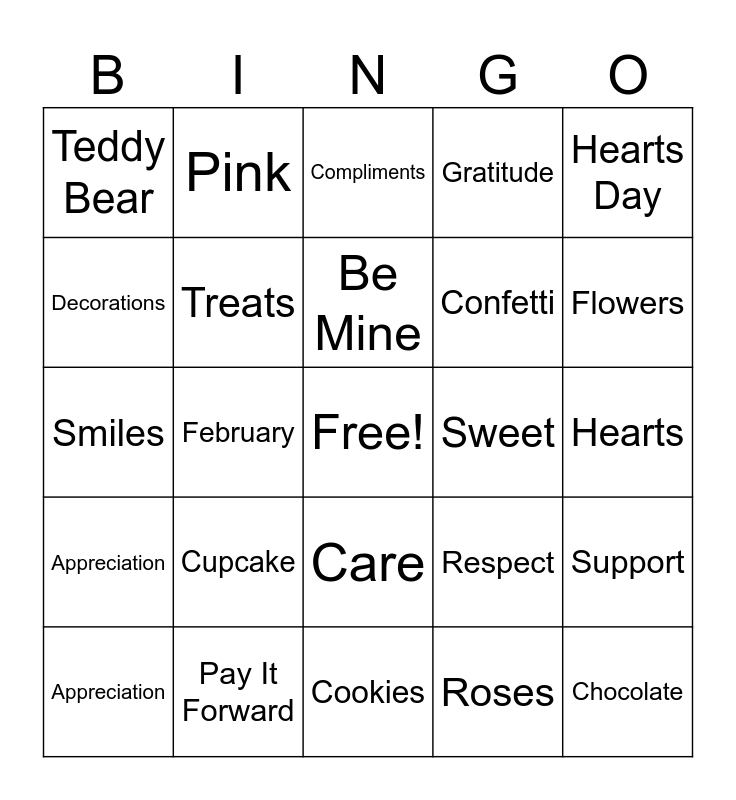 This bingo card has a free space and 50 words: Thank You, Chocolate, Candy, Cookies, Cupcake, Snacks, Pink, Red, Decorations, Cards, Treats, Gratitude, Support, Respect, Positivity, Encouragement, Be Mine, Sweet, Lovely, Hearts Day, February, Roses, Teddy Bear, Confetti, Sparkle, Cheer, Flowers, Kisses, Compliments, Care, Celebration, True Love, Sweethearts, Giving Hearts Day, Pay It Forward, Hugs, February 14th, Bouquet, Valentine, Hearts, Cupid, Love, Kindness, Friendship, Appreciation, Smiles, Warm Wishes, Together, Appreciation and Office Treats.