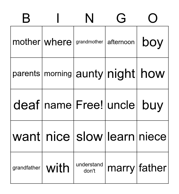 This bingo card has a free space and 58 words: home, with, friend, want, marry, good, morning, good, night, good, afternoon, hello, nice, meet, you, mother, father, boy, girl, aunty, uncle, grandmother, grandfather, niece, nephew, buy, money, pay, how, many, thank, you, me, baby, save, yes, no, name, deaf, hearing, nice, again, learn, student, teacher, learn, fast, slow, understand don't, understand, who, what, where, which, where, when, parents and people.
