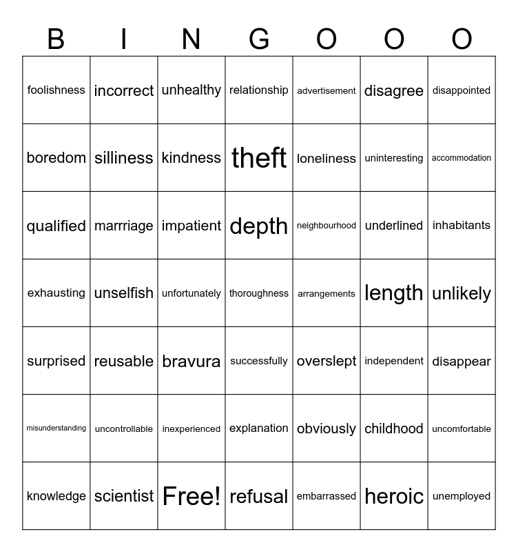 This bingo card has 53 words: Free!, uninteresting, disadvantage, unfortunately, impatient, disappear, incorrect, unemployed, disagree, misunderstanding, disappointed, overslept, underlined, neighbourhood, childhood, inhabitants, boredom, accommodation, refusal, advertisement, loneliness, thoroughness, silliness, foolishness, embarrassed, exhausting, surprised, heroic, unlikely, kindness, surprisingly, successfully, obviously, uncomfortable, independent, reusable, relationship, unselfish, unhealthy, uncontrollable, inexperienced, explanation, qualified, qualifications, knowledge, depth, length, bravura, theft, marrriage, scientist, arrangements and foreigner.