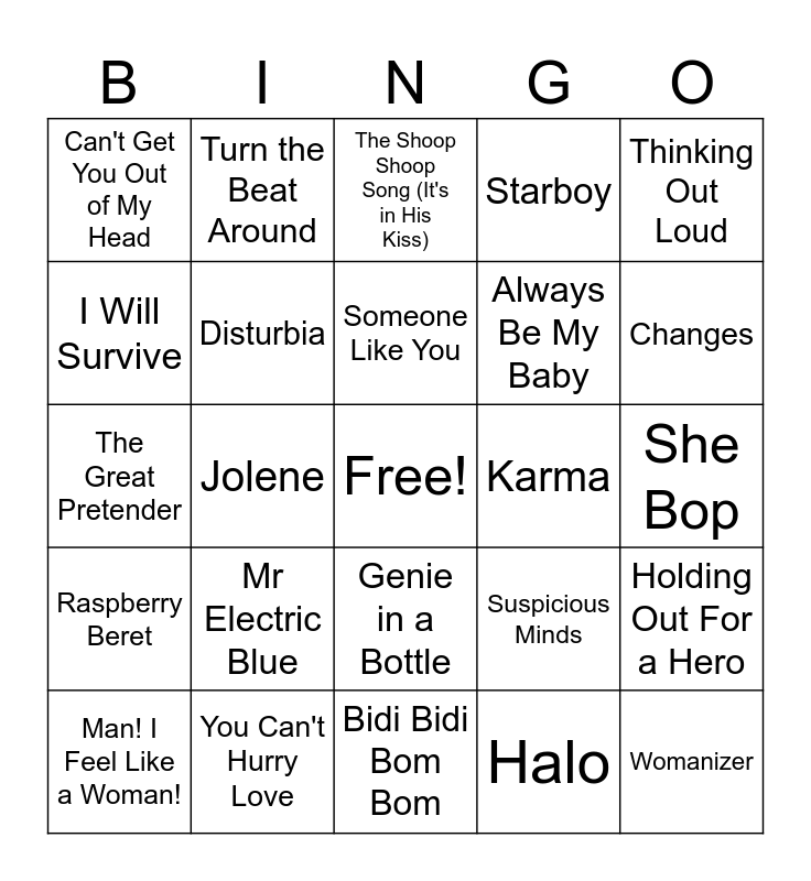 This bingo card has a free space and 42 words: If I Only Had You, Someone Like You, Chain of Fools, Mr Electric Blue, Halo, Holding Out For a Hero, Womanizer, My Heart Will Go On, The Shoop Shoop Song (It's in His Kiss), Genie in a Bottle, She Bop, Changes, Jolene, Thinking Out Loud, Tiny Dancer, Suspicious Minds, This Kiss, The Great Pretender, Careless Whisper, Turn the Beat Around, I Will Survive, Nasty, We R Who We R, Can't Get You Out of My Head, Telephone, Like a Virgin, Always Be My Baby, Family Affair, Can't Take My Eyes Off of You, Still Into You, So What, Raspberry Beret, Disturbia, Bidi Bidi Bom Bom, Try Everything, Man! I Feel Like a Woman!, You Can't Hurry Love, Karma, The Best, Unpretty, Starboy and I'm You Baby Tonight.
