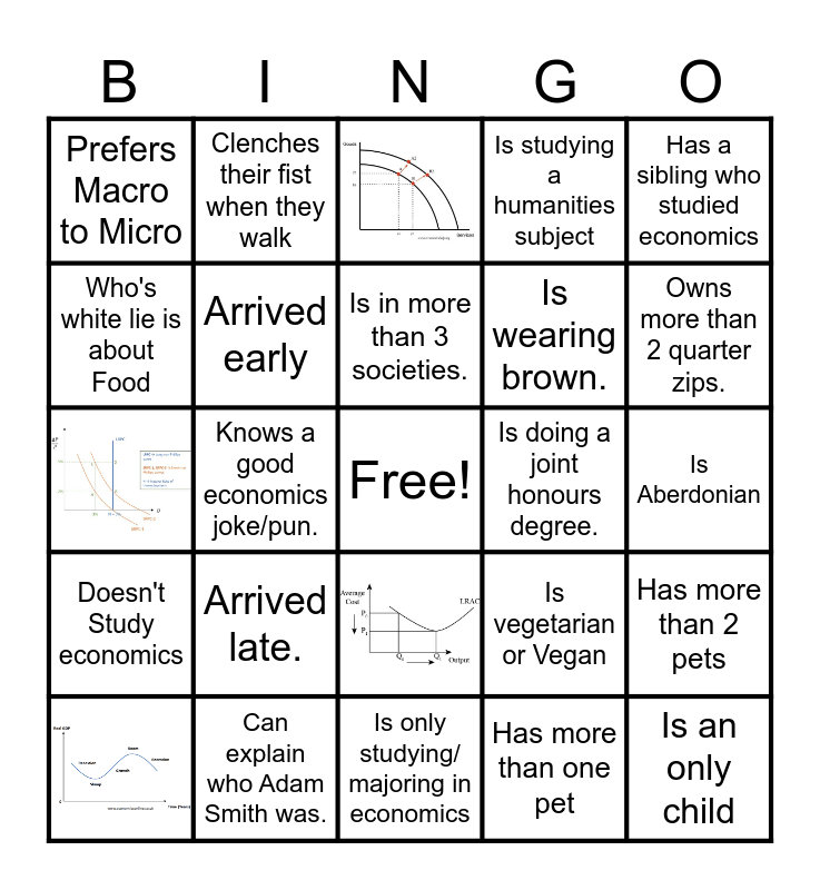 This bingo card has 4 images, a free space and 30 words: Can draw a monopoly graph from memory., Has more than one pet, Did econ at Highers, A-level or IB., Is a middle child, Doesn't Study economics, Arrived early, Has a sibling who studied economics, Clenches their fist when they walk, Who's white lie is about their height., Is in more than 3 societies., Is studying biology, chemistry or physics., Prefers Micro to Macro, Is doing a joint honours degree., Owns more than 2 quarter zips., Can explain who Adam Smith was., Arrived late., Is vegetarian or Vegan, Who's white lie is about drinks, Prefers Macro to Micro, Is Aberdonian, Is only studying/ majoring in economics, Is an only child, Is studying a humanities subject, Has dyed their hair in the last 3 months., Is wearing brown., Who's white lie is about Food, Is the youngest child., Knows a good economics joke/pun., Has more than 2 pets and Has lost 'the game'..