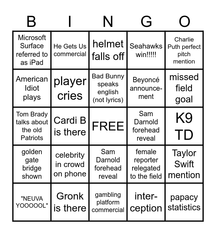 This bingo card has a free space and 31 words: gambling platform commercial, missed extra point, Cardi B is there, unsports-manlike conduct, Microsoft Surface referred to as iPad, helmet falls off, player cries, female reporter relegated to the field, Sam Darnold forehead reveal, inter-ception, K9 TD, papacy statistics, Mariners mention, JSN TD, missed field goal, Budweiser clydesdales, Taylor Swift mention, celebrity in crowd on phone, golden gate bridge shown, Sam Darnold forehead reveal, Charlie Puth perfect pitch mention, "selfie, say cheese", "NEUVA YOOOOOL", He Gets Us commercial, Beyoncé announce-ment, American Idiot plays, Seahawks win!!!!!, Tom Brady talks about the old Patriots, Gronk is there, Bad Bunny speaks english (not lyrics) and failed coach's challenge.