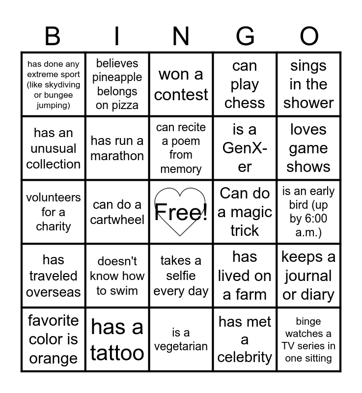 This bingo card has a free space and 24 words: favorite color is orange, doesn't know how to swim, can recite a poem from memory, has met a celebrity, sings in the shower, has done any extreme sport (like skydiving or bungee jumping), believes pineapple belongs on pizza, won a contest, Can do a magic trick, is an early bird (up by 6:00 a.m.), volunteers for a charity, has run a marathon, has lived on a farm, keeps a journal or diary, has an unusual collection, has a tattoo, is a vegetarian, can play chess, loves game shows, has traveled overseas, can do a cartwheel, takes a selfie every day, is a GenX-er and binge watches a TV series in one sitting.