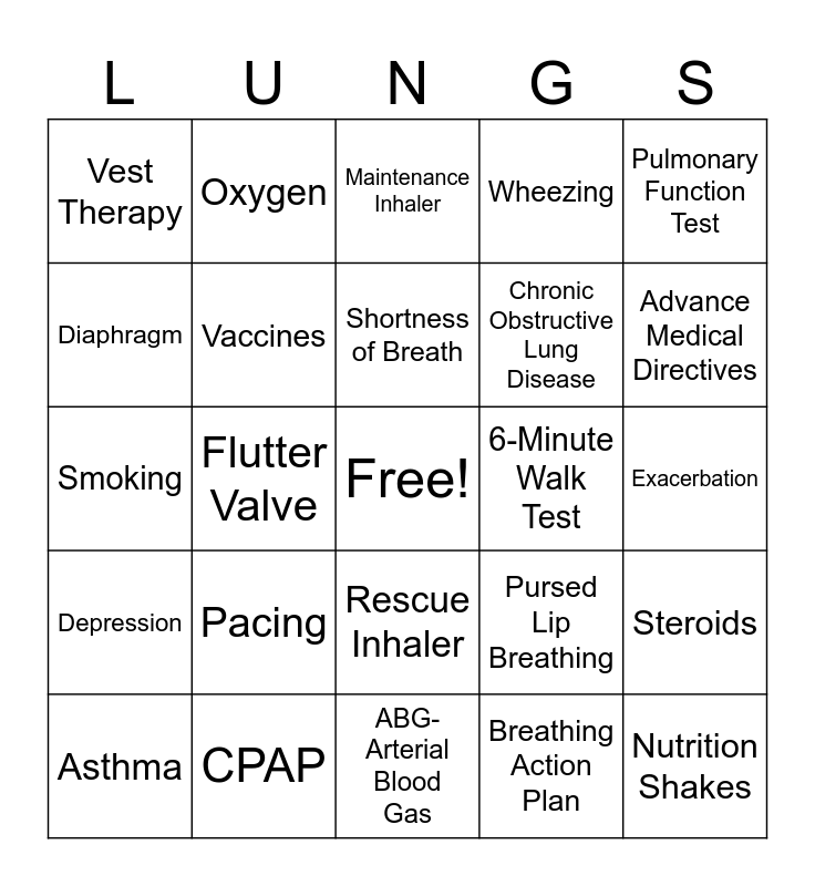 This bingo card has a free space and 26 words: Rescue Inhaler, Breathing Action Plan, Shortness of Breath, CPAP, Pulmonary Function Test, Vest Therapy, Diaphragm, Oxygen, Exacerbation, Pursed Lip Breathing, Chronic Obstructive Lung Disease, Smoking, Steroids, Asthma, Flutter Valve, Controlled cough- Huff Cough, Wheezing, Depression, Maintenance Inhaler, Nutrition Shakes, Advance Medical Directives, ABG- Arterial Blood Gas, 6-Minute Walk Test, Pacing, Vaccines and Oximeter.
