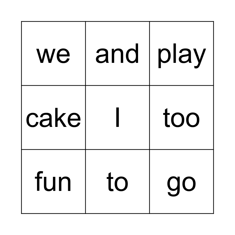 This bingo card has a free space and 8 words: too, play, and, fun, we, go, cake and to.