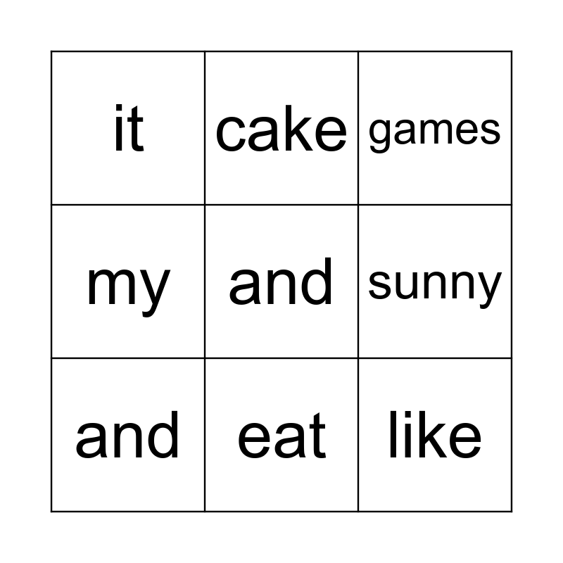 This bingo card has a free space and 8 words: sunny, games, cake, and, it, like, my and eat.