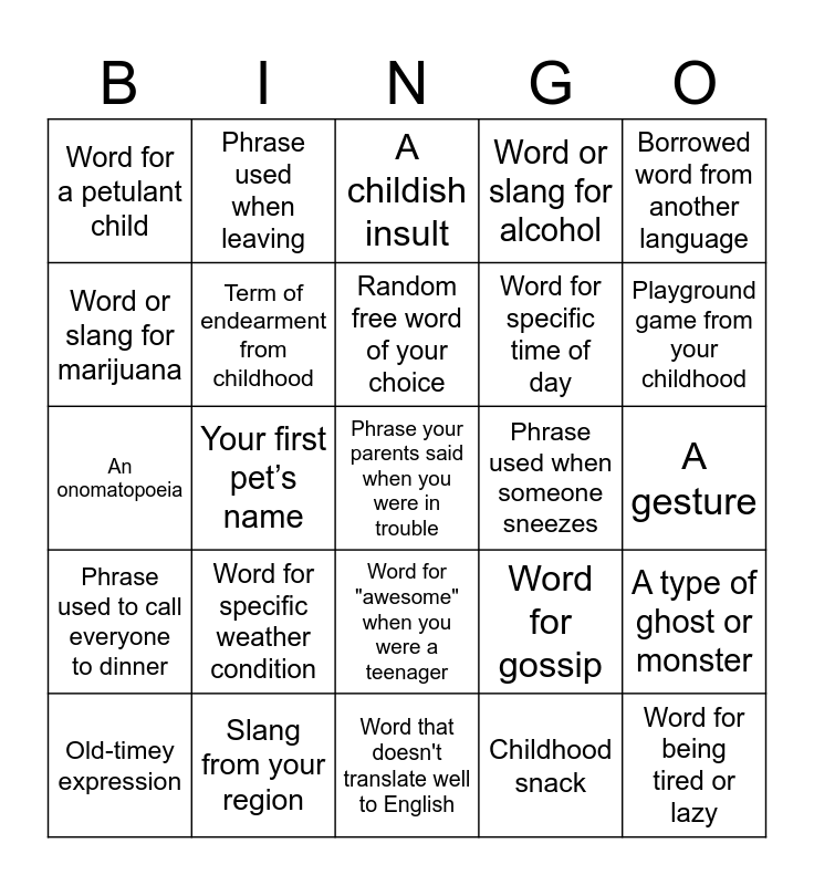 This bingo card has 30 words: Slang from your region, Word your grandmother said, Your first pet’s name, Word used for a corner store, Word for a petulant child, A childish insult, Term of endearment from childhood, Word for "awesome" when you were a teenager, Phrase used when someone sneezes, Word that doesn't translate well to English, A gesture, Phrase your parents said when you were in trouble, Childhood snack, Word for being tired or lazy, Playground game from your childhood, Swear word, Word for gossip, Phrase used to call everyone to dinner, Word for specific weather condition, Borrowed word from another language, An onomatopoeia, Word for “maybe”, Phrase used when leaving, Word for specific time of day, Word or slang for marijuana, Word or slang for alcohol, A type of ghost or monster, Old-timey expression, Random free word of your choice and Word for an alien.