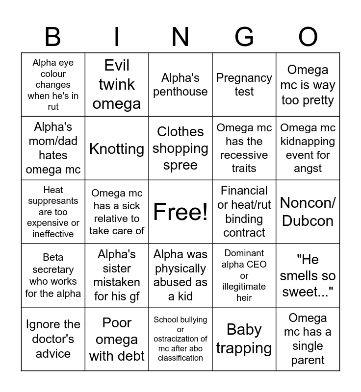 This bingo card has a free space and 24 words: Alpha's sister mistaken for his gf, Poor omega with debt, Clothes shopping spree, Ignore the doctor's advice, Omega mc is way too pretty, Alpha eye colour changes when he's in rut, Alpha's mom/dad hates omega mc, Evil twink omega, Financial or heat/rut binding contract, Alpha was physically abused as a kid, Omega mc has the recessive traits, Heat suppresants are too expensive or ineffective, Dominant alpha CEO or illegitimate heir, "He smells so sweet...", Knotting, Baby trapping, Noncon/ Dubcon, Alpha's penthouse, Omega mc kidnapping event for angst, Omega mc has a sick relative to take care of, Omega mc has a single parent, Beta secretary who works for the alpha, Pregnancy test and School bullying or ostracization of mc after abo classification.