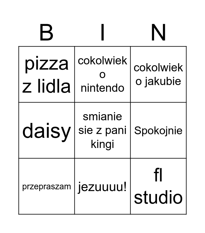This bingo card has a free space and 8 words: Spokojnie, cokolwiek o jakubie, cokolwiek o nintendo, przepraszam, pizza z lidla, fl studio, daisy and jezuuuu!.