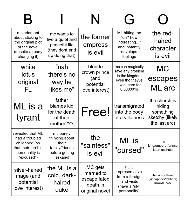 This bingo card has a free space and 24 words: mc barely thinking about their family/friends before getting isekaied, the ML is a cold, dark-haired duke, blonde crown prince (and potential love interest), silver-haired mage (and potential love interest), the red-haired character is evil, mc adamant about sticking to the original plot of the novel (despite already changing it), white lotus original FL, mc wants to live a quiet and peaceful life (they dont end up doing that), transmigrated into the body of a villainess, the "saintess" is evil, mc can magically save any problem in the kingdom even tho theyve lived there for 0.000001s, ML is a tyrant, ML is "cursed", the king/emperor/prince is an asshole, "nah there's no way he likes me", POC representative from a foreign land visits (have a "sly" personality), the church is hiding something sketchy (likely the last arc), the former empress is evil, MC escapes ML arc, father blames kid for the death of their mother???, the side villains (kidnappers/robbers) always POC, revealed that ML had a troubled childhood (so that their terrible personality is "excused"), ML hitting the "oh? how interesting..." and instantly develops feelings and MC gets married to escape fated death in original novel.