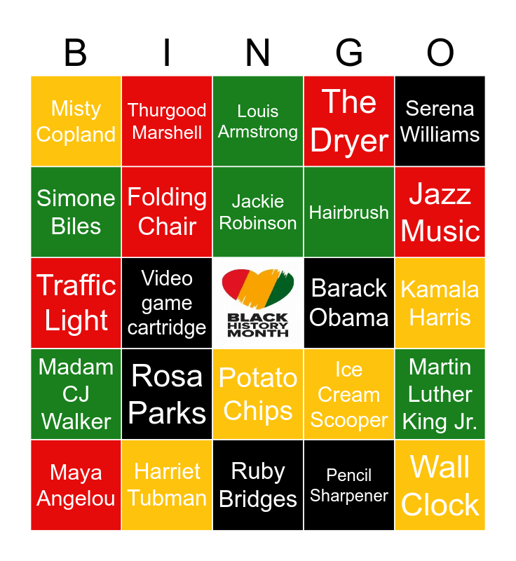 This bingo card has a free space and 24 words: Rosa Parks, Harriet Tubman, Jackie Robinson, Maya Angelou, Serena Williams, Misty Copland, Simone Biles, Thurgood Marshell, Barack Obama, Potato Chips, Hairbrush, Traffic Light, Ice Cream Scooper, Martin Luther King Jr., Folding Chair, Pencil Sharpener, Kamala Harris, Louis Armstrong, Jazz Music, Video game cartridge, Wall Clock, Madam CJ Walker, The Dryer and Ruby Bridges.
