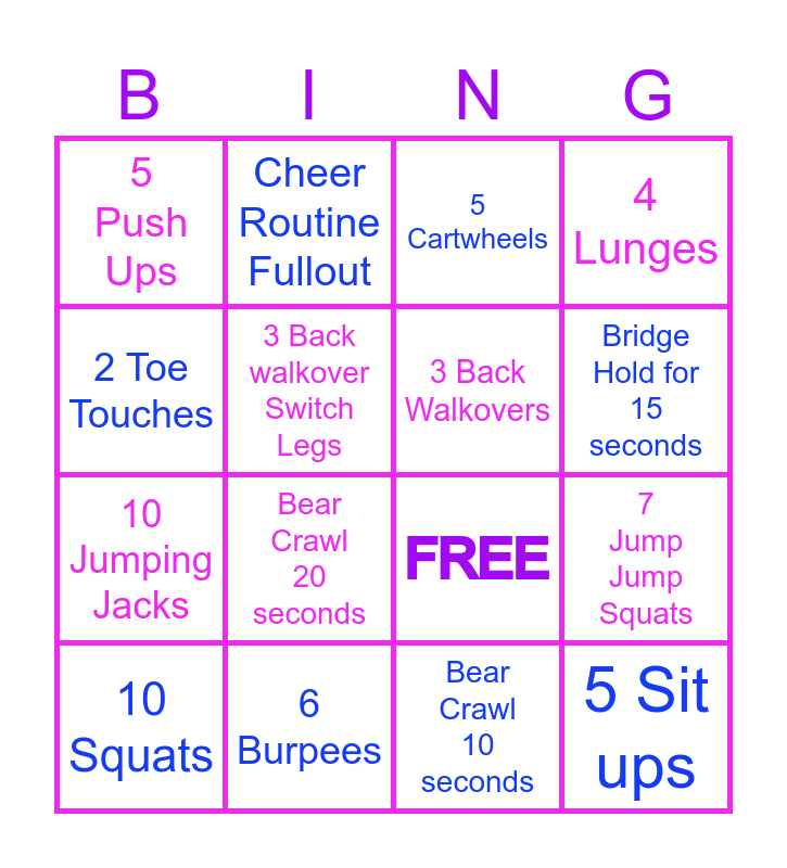 This bingo card has 16 words: 6 Burpees, 7 Jump Jump Squats, 5 Cartwheels, 5 Push Ups, 10 Jumping Jacks, Cheer Routine Fullout, FREE, Bear Crawl 10 seconds, 2 Toe Touches, 3 Back walkover Switch Legs, 10 Squats, 4 Lunges, Bear Crawl 20 seconds, Bridge Hold for 15 seconds, 3 Back Walkovers and 5 Sit ups.