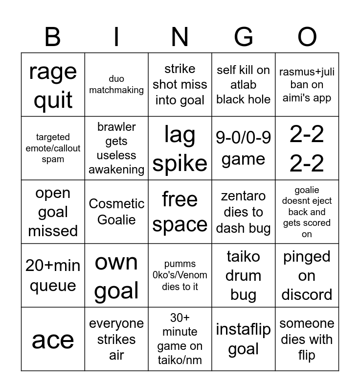 This bingo card has a free space and 24 words: own goal, everyone strikes air, lag spike, ace, rasmus+juli ban on aimi's app, rage quit, targeted emote/callout spam, duo matchmaking, zentaro dies to dash bug, pumms 0ko's/Venom dies to it, 9-0/0-9 game, open goal missed, taiko drum bug, pinged on discord, brawler gets useless awakening, instaflip goal, goalie doesnt eject back and gets scored on, strike shot miss into goal, 2-2 2-2, Cosmetic Goalie, someone dies with flip, 20+min queue, self kill on atlab black hole and 30+ minute game on taiko/nm.