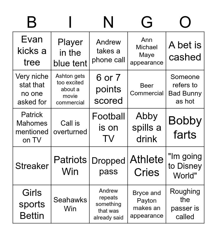 This bingo card has a free space and 24 words: Patriots Win, Seahawks Win, 6 or 7 points scored, Girls sports Bettin, A bet is cashed, Evan kicks a tree, Very niche stat that no one asked for, Player in the blue tent, Abby spills a drink, Dropped pass, Beer Commercial, Patrick Mahomes mentioned on TV, Athlete Cries, "Im going to Disney World", Ashton gets too excited about a movie commercial, Bryce and Payton makes an appearance, Bobby farts, Andrew takes a phone call, Someone refers to Bad Bunny as hot, Call is overturned, Roughing the passer is called, Streaker, Ann Michael Maye appearance and Andrew repeats something that was already said.