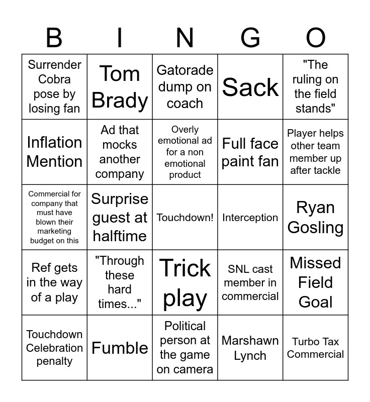 This bingo card has a free space and 38 words: A shot of the Golden Gate Bridge, A shot of Lombard St. (crooked street), Movie Trailer, Ad that mocks another company, Missed Field Goal, "Through these hard times...", Overly emotional ad for a non emotional product, Timothee Chalamet, "The ruling on the field stands", Full face paint fan, Surprise guest at halftime, Sack, Turbo Tax Commercial, Ryan Gosling, Inflation Mention, Ref gets in the way of a play, Halftime show mishap, Gatorade dump on coach, Blocked kick, Interception, Surrender Cobra pose by losing fan, Fumble, Player helps other team member up after tackle, Touchdown Celebration penalty, Royal Family Appearance, Political person at the game on camera, Another sports star at the game on camera, An ad for a podcast, Steve Martin and / or Martin Short, "He gets us", Player does a flip, Trick play, Marshawn Lynch, Tom Brady, Reference back to the Seahawks / Patriots Superbowl interception, SNL cast member in commercial, Commercial for company that must have blown their marketing budget on this and Surprise baby announcement / wedding proposal.