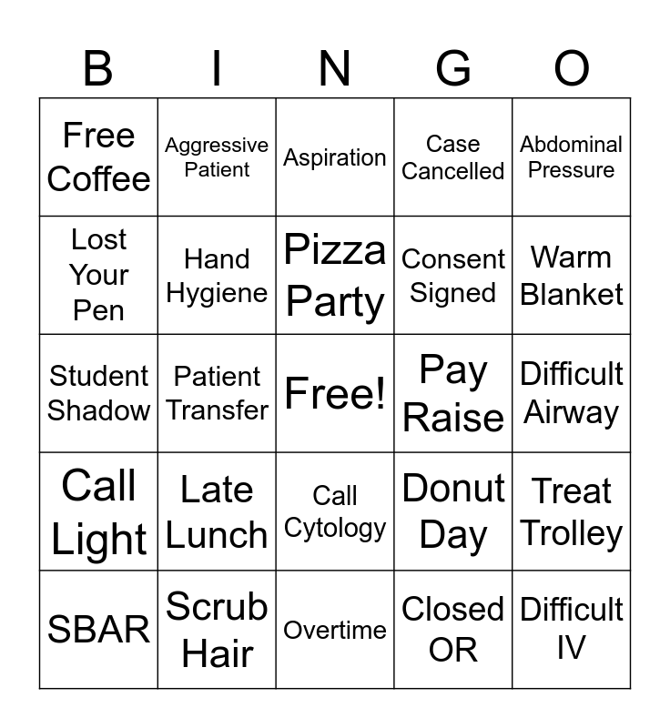 This bingo card has a free space and 49 words: Late start on First Case, Difficult IV, Add-on Case, Overtime, Late Lunch, Bad Prep, Aggressive Patient, Welcome Joint Commission, Lost Your Pen, Code Brown, Hand Hygiene, Case Cancelled, Treat Trolley, Donut Day, Great OR Playlist, Short Turnover, Pizza Party, Pay Raise, Fully Staffed, Abdominal Pressure, Patient Transfer, Closed OR, Free Coffee, Consent Signed, Turnover Delay, Warm Blanket, SBAR, Surgeon Arrives On Time, Call Cytology, Call Light, Perforation, Wrong Patient, Occurrence, PTO, Scrub Hair, Happy Hour, Smooth Intubation, Specimen Collection, Difficult Airway, Epic Downtime, Sterile Field, Correct Surgical Count, Float Help, New Resident, Student Shadow, Aspiration, Wrong Site, No Parking and Cafeteria is Closed.
